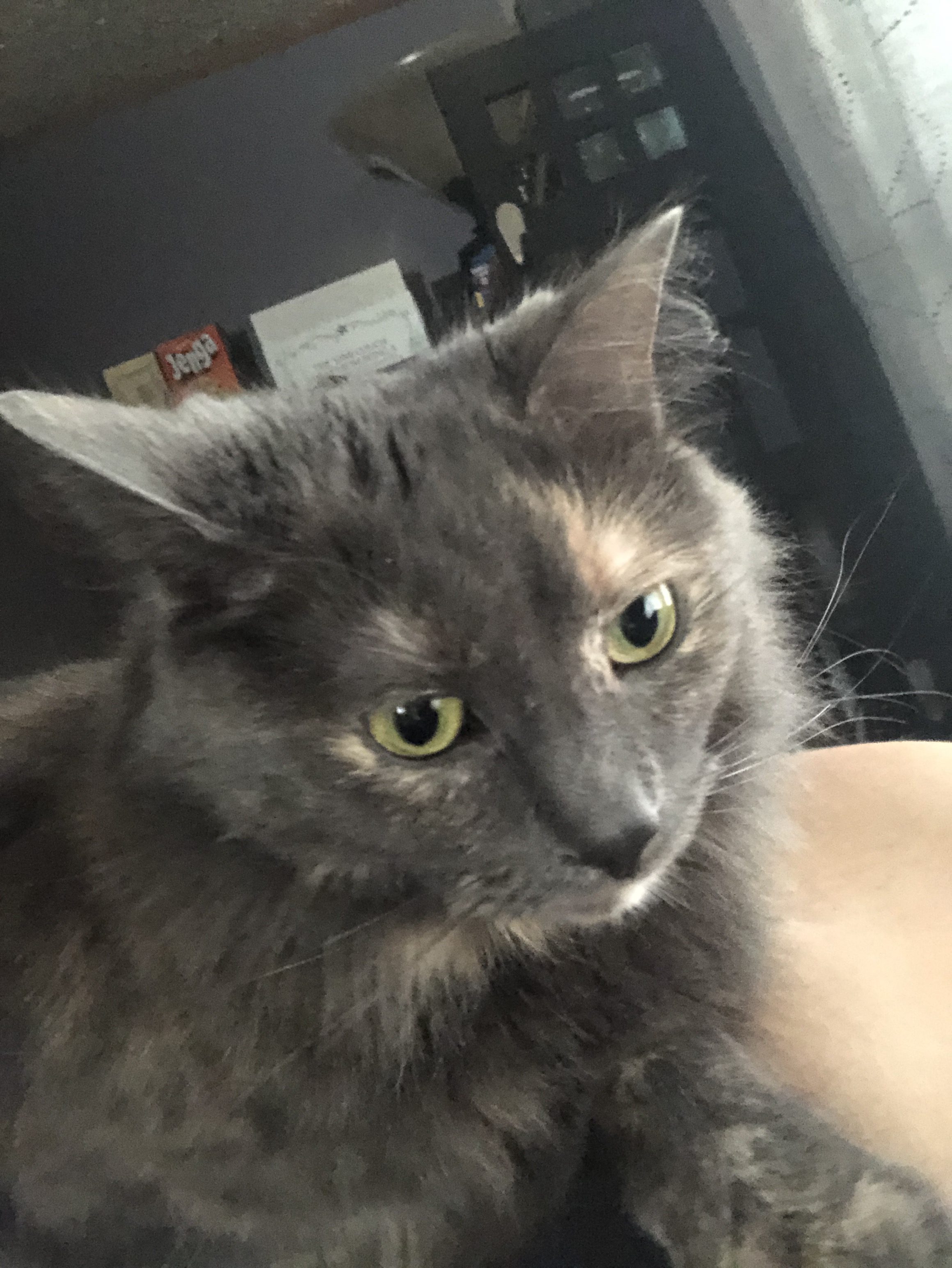 Grey cat with slight tan coloring around her eyes looking beautiful